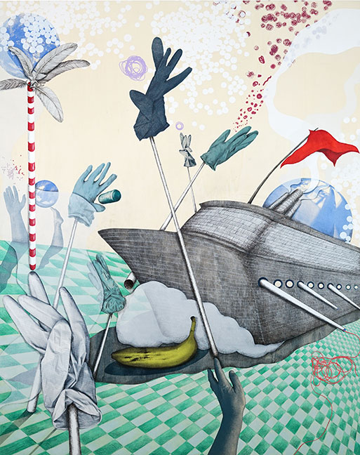 Das Boot, 2025. 160 x 130 cm, Acryl, Ink, Pencil, Screenprinting on Wood